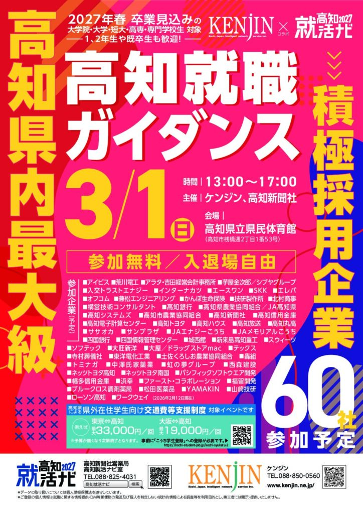 高知県内の積極採用企業 約60社が集まる《高知就職ガイダンス》を開催します!