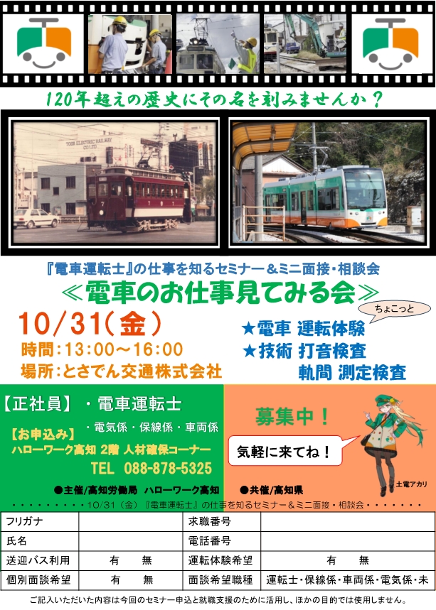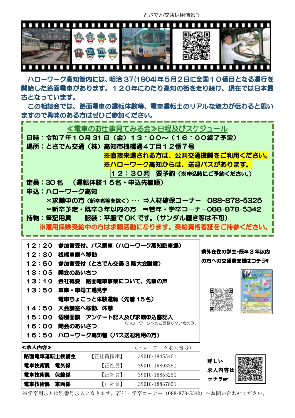ハローワーク高知では、「電車運転士」の仕事を知ってもらうセミナー&ミニ面接・相談会を開催します。路面電車の運転体験(先着15名)等、電車運転士のリアルな魅力を知ることができますので、興味のある方はぜひご参加ください!