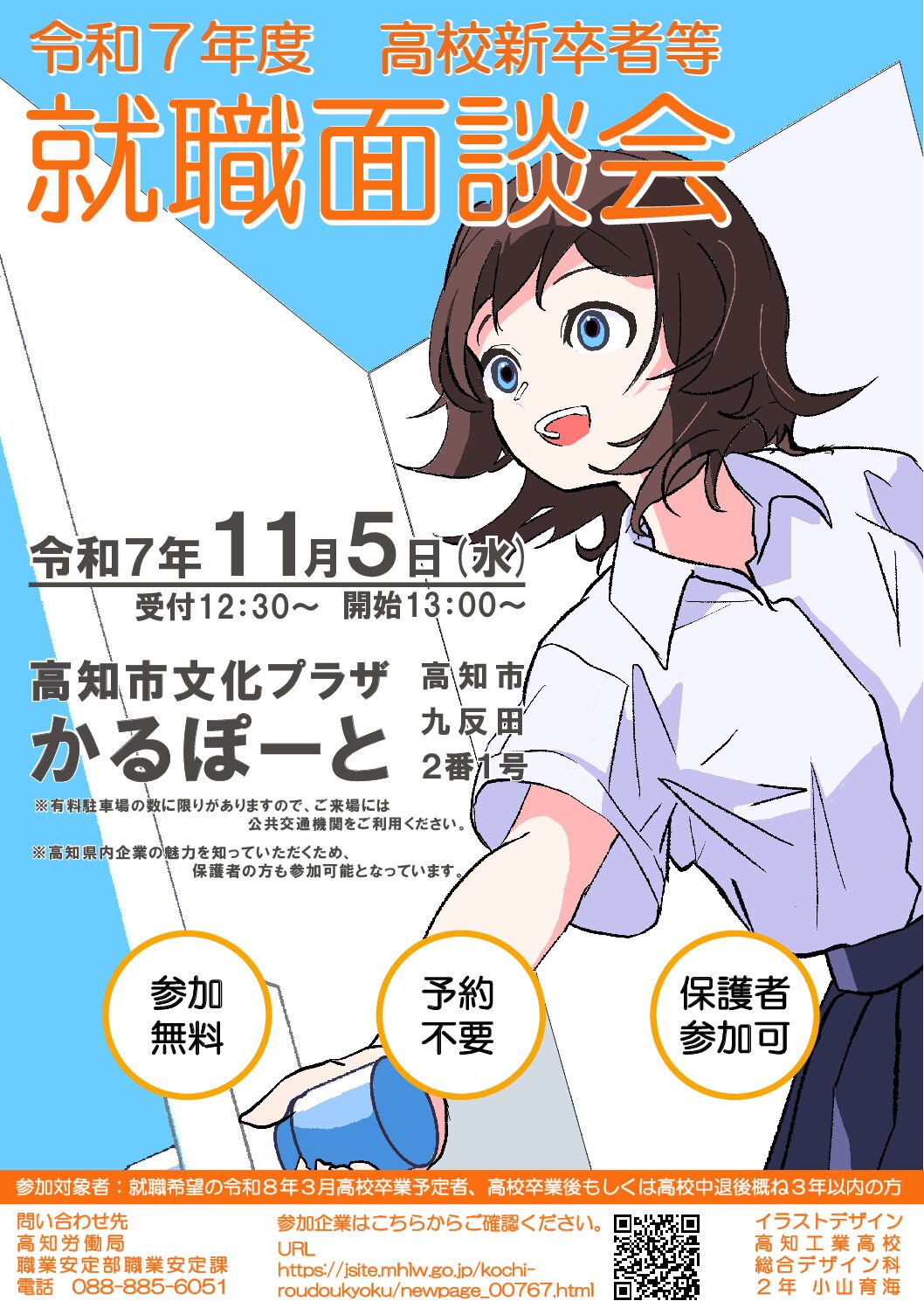 高知労働局では、令和8年3月新規高校卒業予定者、高校卒業後もしくは高校中退後概ね3年以内の求職者に対して就職機会を確保するとともに、広く高知県内企業の魅力を知ってもらうことにより、県内企業の若年労働者の確保を支援するため「令和7年度高校新卒者等就職面談会」を開催します。
